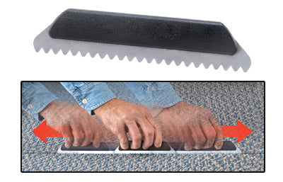 This ultra-straight spring steel row finder has smooth, rounded notches that opens rows of difficult carpets. The rounded ends can easily enter the rows of Berber and loop pile commercial carpets without catching loops. Once this tool finds a row, it can be moved back and forth in a sawing action to open the row. After use, a seam cutter is able to follow the row with reduced shearing of yarns. The textured plastic handle provides good grip. Net weight: 1 ¼ oz.